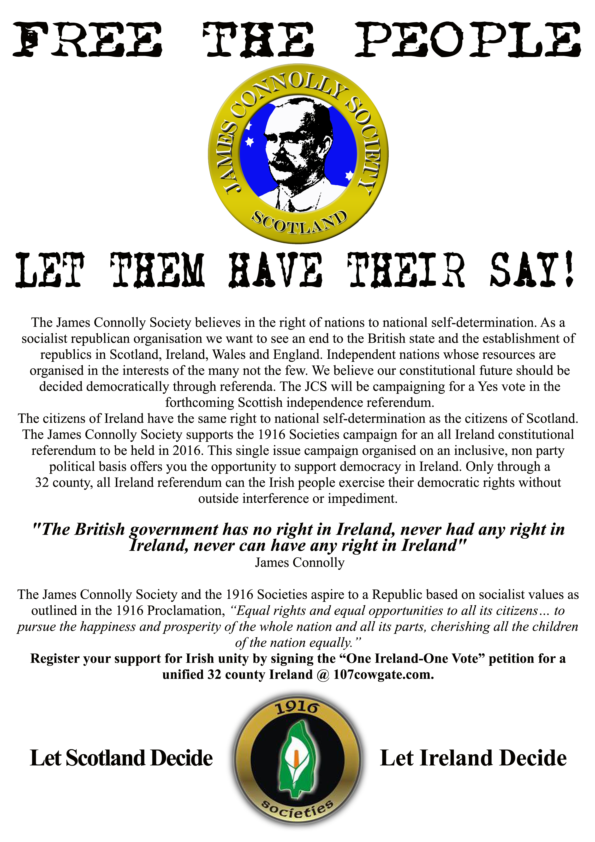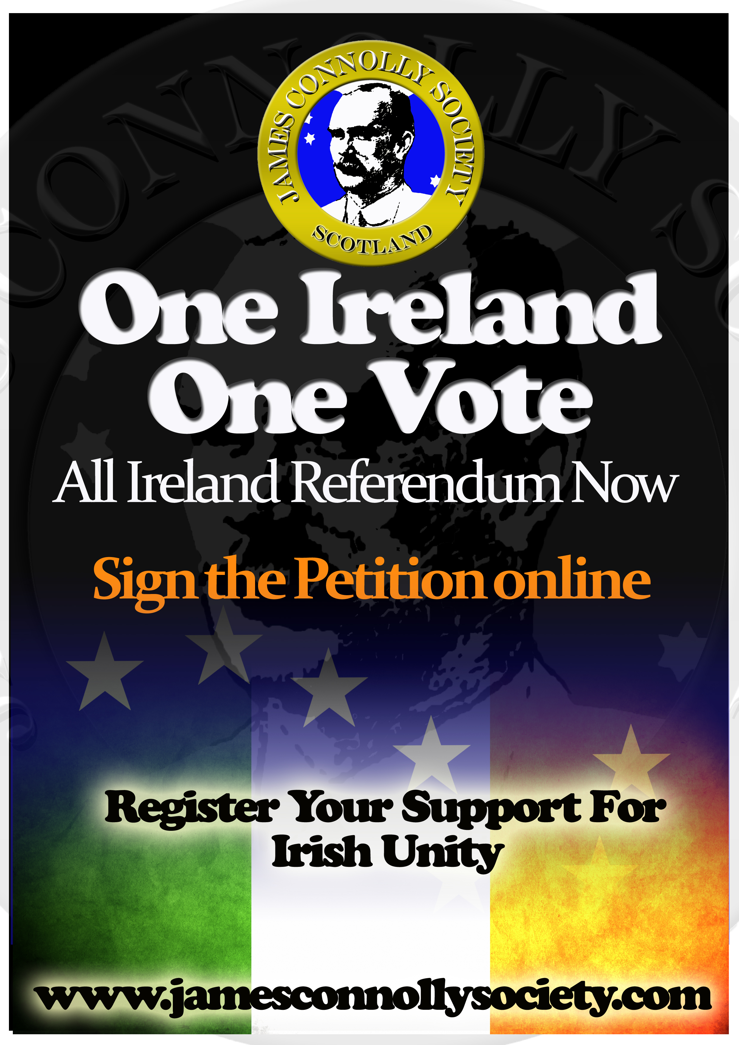 The James Connolly Society is today launching a campaign in support of an all Ireland constitutional referendum in Ireland to be held in 2016. This referendum, initiated in Ireland by the 1916 Societies, would resolve the democratic deficit which currently exists due to the British state’s continued occupation of the six counties. Wales held a constitutional referendum last year and Scotland is scheduled to hold an independence referendum in 2014. Now is the time for the citizens of Ireland to have their say on the constitutional future of their country.