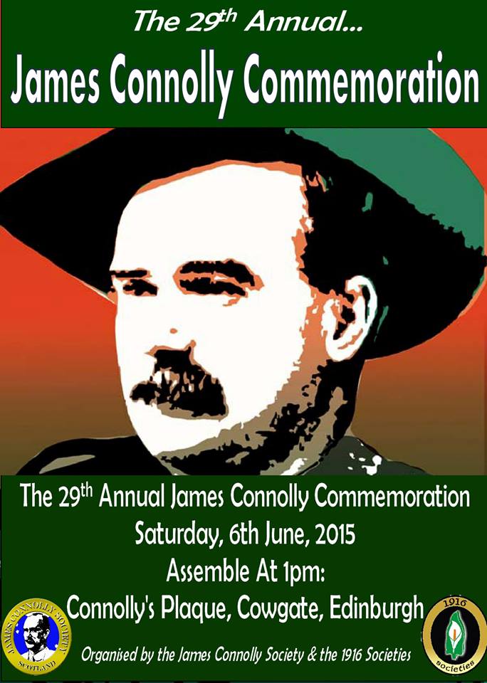 The 29th annual James Connolly commemoration will be held in Edinburgh’s Cowgate on Saturday 6th June at 1pm. This event is held on the same weekend (the nearest Saturday to Connolly’s birth in the city) every year. The commemoration takes the form of a wreath laying ceremony with non-party political speakers and live music. The event is organised in conjunction with local residents and open to all the family.
